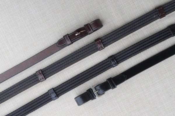 The 3/4″ Red Barn Special Grip Rein combines both web and exterior strips of rubber, with stops, for added stay. A best-seller. Black Buckle with Stops.